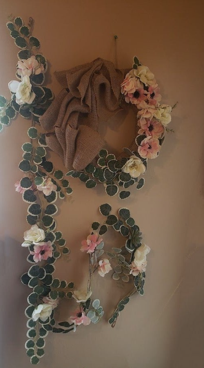 Door wreath decorated with natural burlap, Blush Roses, white Anemones, Succulents and Trailing Eucalyptus green leaves.