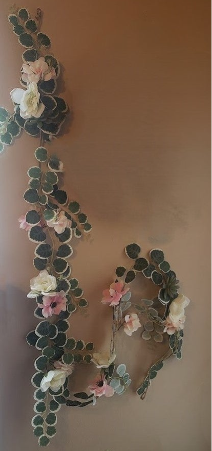 Garland decorated with blush Roses, white Anemones, Succulents and trailing Eucalyptus green leaves.