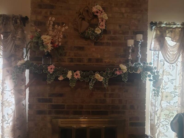 Door wreath decorated with natural burlap, Blush Roses, white Anemones, Succulents and Trailing Eucalyptus green leaves.